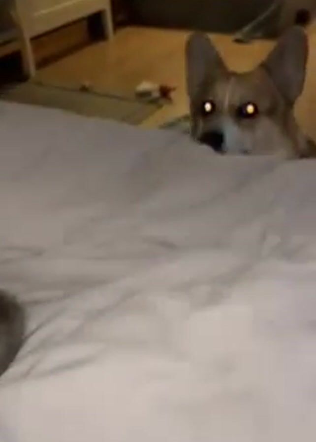 plate of food on a bed with a corgi dog looking at it. The food appears to be a salad with seafood and grated cheese. Next to the plate is a tall wine glass and a bottle of sparkling wine on a silver tray. The corgi is lying on the bed, looking directly at the food with its eyes glowing in the low light. The background shows a bedroom with a dresser and various items on the floor.