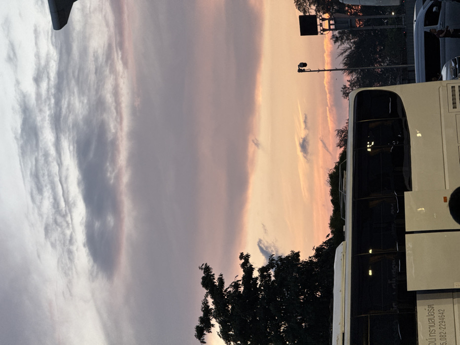 The image depicts an outdoor scene at either dusk or dawn, characterized by a gradient sky overhead and a transportation area in the foreground. The upper portion of the sky shows light grey-blue with scattered, thin clouds, transitioning into a prominent band of purple-grey clouds, and culminating in warm orange, pink, and light purple hues near the horizon line. In the lower third of the frame, the side and rear of a large, white passenger coach bus occupy the left and center. The bus features multiple dark-tinted windows. Along its lower left side, Thai script is visible, identifying the vehicle as "Nok Air Transport" with a contact number "05.082-2294642". To the right of the white bus, a dark-colored passenger van or minivan is partially visible, and a single individual, appearing to be a male in a dark shirt, stands near it. The midground and background consist of a line of dark, silhouetted trees stretching across the horizon. Above the trees on the right, a tall pole supports a dome-shaped security camera, and further right, a taller structure with a dark, rectangular panel at its top is visible. The environment suggests an active transportation hub or parking facility. This scene is located at Phuket International Airport, situated in Sakhu, Thailand.