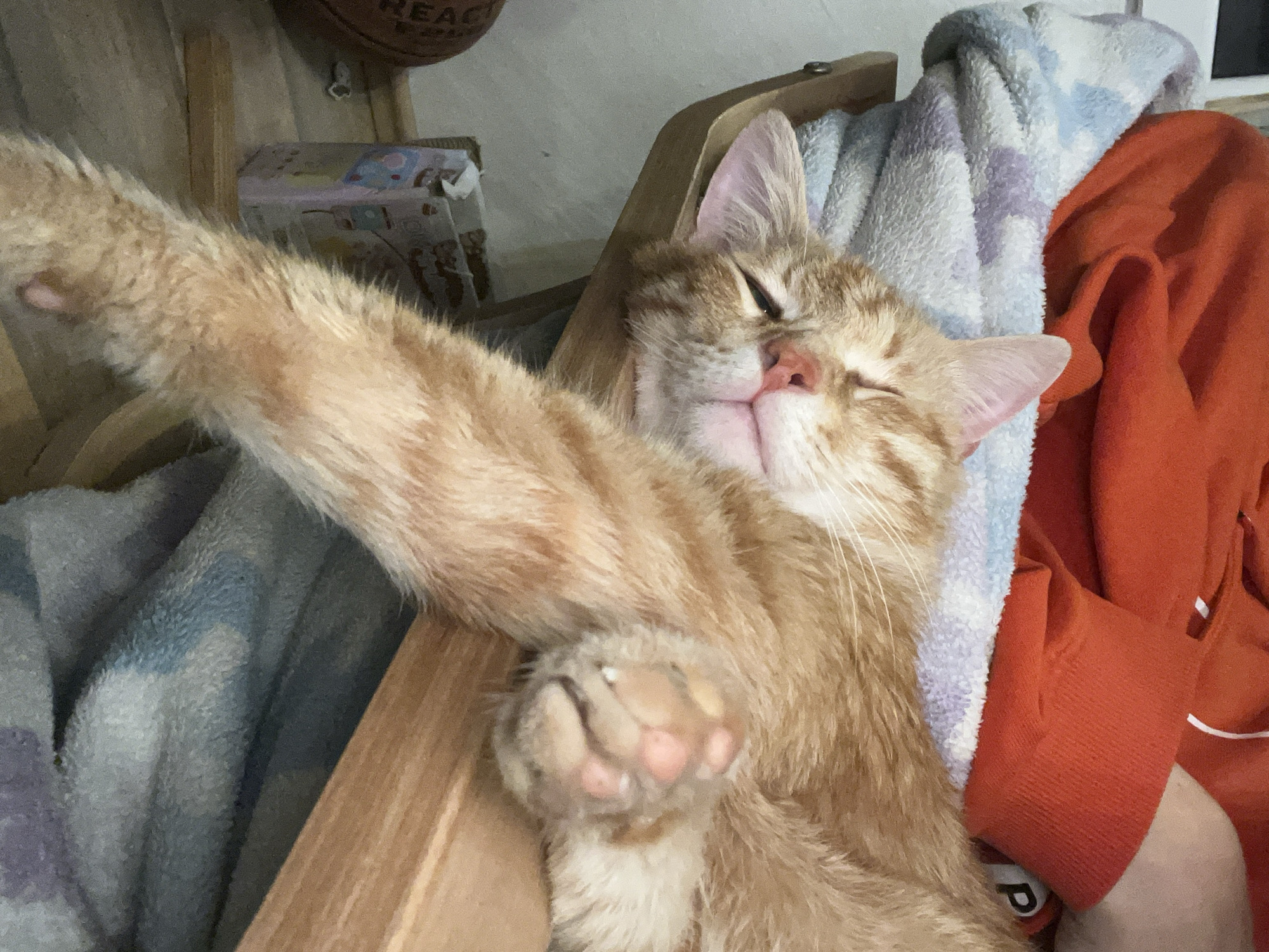 A ginger tabby cat is sleeping on its back in a wooden chair, with a grey and blue patterned blanket and an orange garment visible nearby
