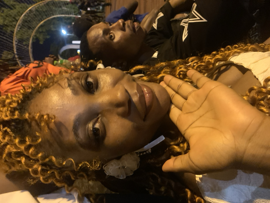 A close-up, low-angle shot features a woman with curly, golden-brown hair. She is lying down, her hand near her face. Behind her, slightly out of focus, lies a man in a black shirt with a white star. The scene seems to be outdoors at night. There is a metal structure behind the man. Other people and objects are faintly visible in the background. The woman's expression is calm.
