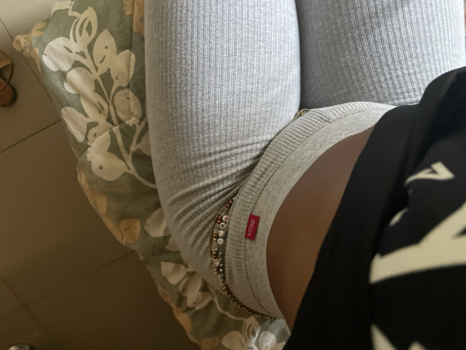 The image presents a top-down view focused on a person's lower torso and upper thighs. The individual is wearing light grey ribbed leggings or pants. A black garment, possibly a t-shirt, is visible on the left side, partially covering the abdominal area. Multiple strands of beaded waist beads are present around the upper thigh/hip region. One prominent strand displays white letter beads spelling "HERO." Other strands are composed of smaller, varied colored beads, including gold, clear, and red. A small red fabric tag with white lettering, "JINGZHI," is visible on the grey garment near the waistline on the left. The immediate environment includes a dark, smooth surface on the lower left and a patterned fabric, likely a pillow or blanket, with a green/khaki base and white floral patterns, positioned on the upper right. A section of light-colored tiled flooring is visible at the top edge of the frame, with a brown object, possibly a sandal or shoe, partially present on the tile. The specific location within the city of Ajaokuta, Nigeria, cannot be determined from the visual information provided.