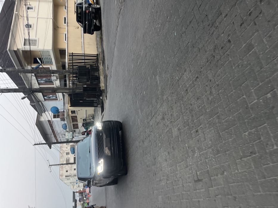 The scene depicts a street in Ojomu, Nigeria, under an overcast sky. A dark-colored Range Rover SUV, with its headlights illuminated, is positioned in the left-center, moving forward on a grey interlocking paver road. A pedestrian, wearing a light-colored top, is partially visible on the far left sidewalk. On the right side of the paved street, a black pickup truck with white and yellow markings is parked, facing away from the viewer. Adjacent to the pickup truck, a two-story building with a cream-colored facade, brown roof, and a second-story balcony with a dark railing is visible, fronted by a black metal fence and gate structure. Further left, another multi-story building with a lighter facade features multiple blue satellite dishes. Overhead, a network of electrical or communication wires spans between several utility poles. A second individual is partially visible near a property gate on the left. The road surface exhibits darker stains in various areas.