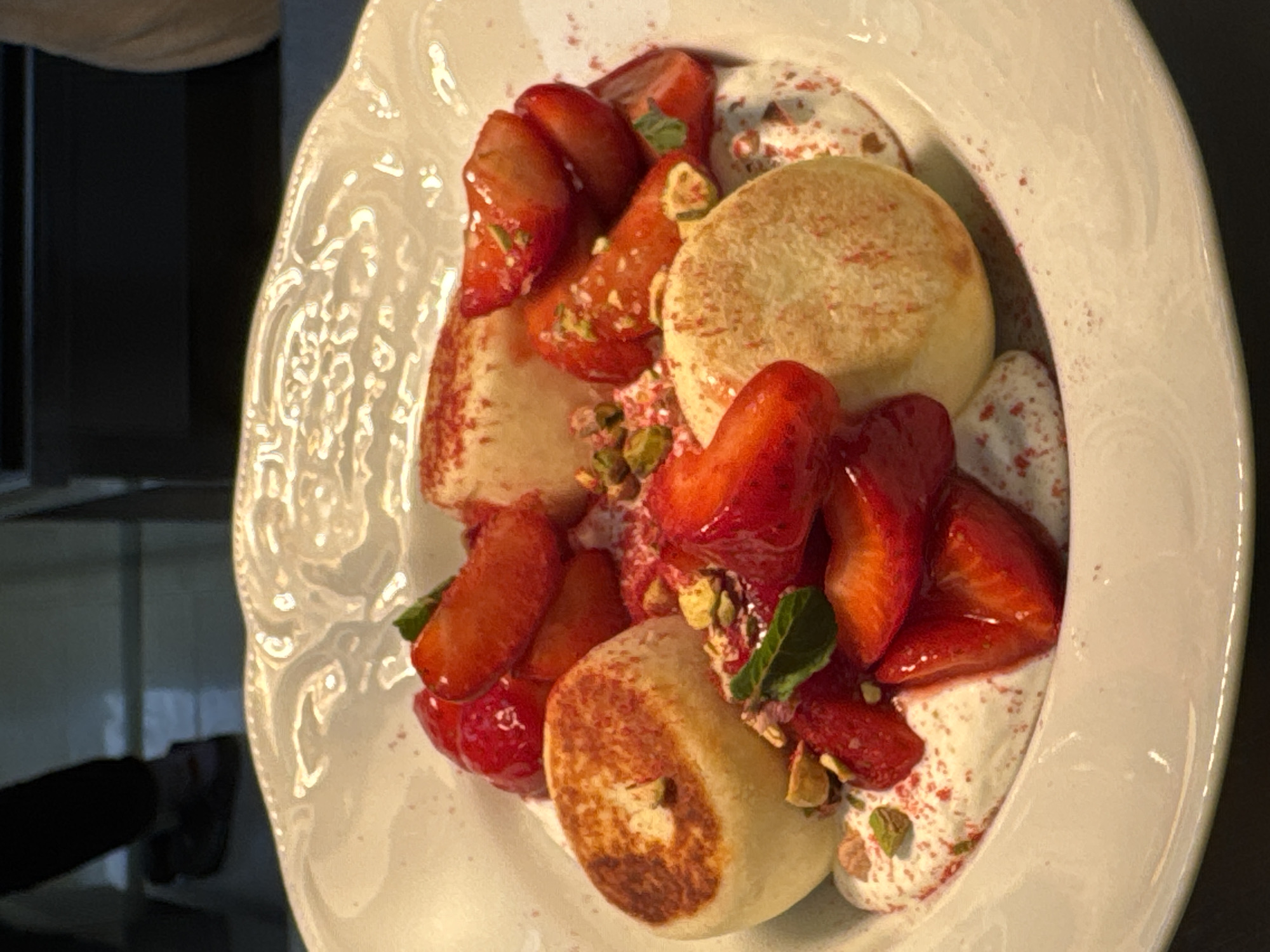 close-up of a dessert served on a white, ornate plate. The dessert consists of two small, round, golden-brown cakes or pancakes, garnished with sliced strawberries, a dollop of cream, and chopped pistachios. The dessert is sprinkled with red powder. The setting appears to be indoors, possibly a restaurant or dining area, based on the plate and the partial view of the background. No people are visible in the close-up shot, however there is a person's leg and foot in the background. The image does not provide information regarding the location of Boreti, Montenegro.