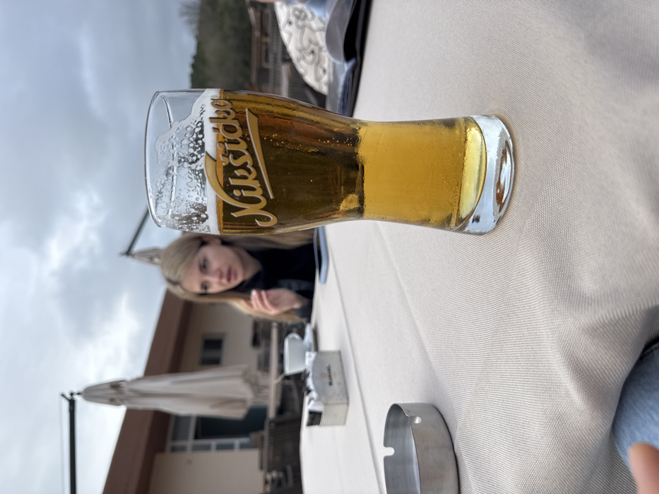 The image depicts an outdoor cafe or restaurant terrace located in Zagora, Montenegro, under an overcast sky. In the foreground, a glass of Nikšićko beer, approximately two-thirds full with golden liquid, foam, and condensation on its exterior, is prominently positioned on a light-colored, possibly beige, tablecloth. To the immediate left of the beer glass, a silver-colored metal ashtray is present. Further left and behind the ashtray, a small rectangular silver container labeled "BARA" is visible, alongside a white coffee cup and saucer. A dark-colored smartphone rests flat on the tablecloth between the coffee cup and a seated individual. A blurry, blonde-haired female wearing a dark top is seated across the table behind these objects, with her right hand slightly raised near her face. Her gaze is directed towards the left side of the frame. In the background, a light-colored building with a brown roofline is visible on the left, accompanied by two large, folded light-colored patio umbrellas. Distant trees and foliage are present on the right side of the background, under the cloudy sky.