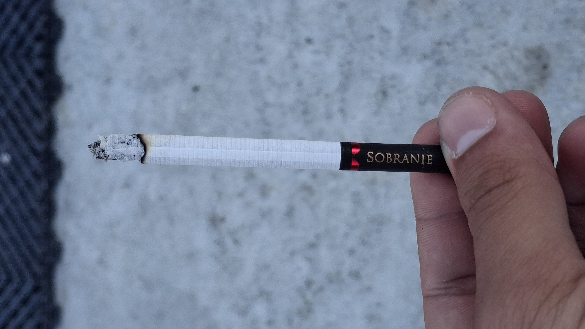 - "A hand holds a partially smoked Sobranie cigarette against a background of gray concrete and a dark gray patterned surface" by FM-rILbG3, licensed under CC BY 4.0
