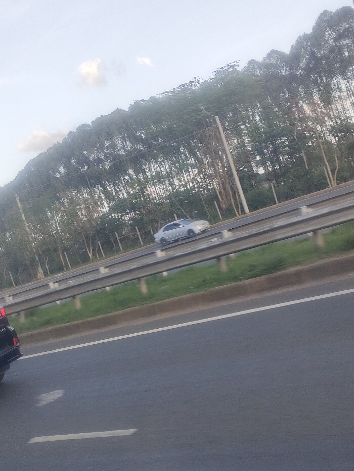 The image depicts a multi-lane asphalt highway within Juja ward, Kenya, under a light blue sky with scattered white clouds. A dense line of tall, slender trees, consistent with eucalyptus species, borders the highway on the right side. A median strip, featuring green grass and a metal guardrail barrier, separates opposing directions of traffic. In the foreground, the rear section of a dark-colored vehicle is visible on the left lane, suggesting forward movement. On the opposing carriageway, separated by the median, a silver sedan, possibly a Mercedes-Benz model, is in motion, heading away from the observer. White lane markings are visible on the asphalt. No individuals are discernible in the frame. The lighting indicates daytime conditions, possibly early morning or late afternoon.