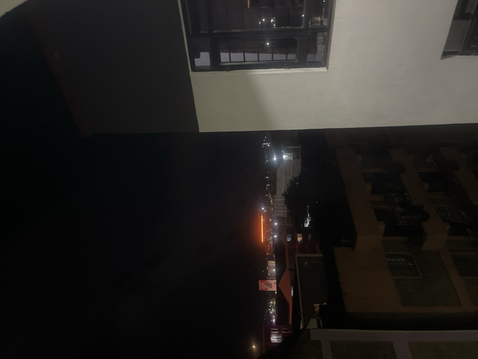 The image captures a nocturnal, elevated wide-angle view of the city of Thika, Kenya. The upper portion of the frame displays a uniformly dark night sky. In the immediate foreground, on the right side, a section of a light-colored, possibly cream or off-white, building facade is visible, topped by a darker, possibly gray, architectural element. Embedded within this facade is a dark-framed window, the glass of which reflects ambient city lights. Below the vantage point, a cluster of multi-story buildings, primarily dark in color, forms the midground. Details of these structures are largely obscured by darkness, though some balconies are faintly discernable. The background reveals the distant urban landscape, punctuated by numerous artificial light sources. A prominent horizontal orange illuminated strip is visible on a distant structure, likely a large sign or building. To the left of this orange light, a tall, vertically oriented billboard featuring red and white illumination is visible. Scattered white lights, consistent with streetlights and building interiors, are present throughout the distant city scene. No individuals, specific actions, or direct interactions are visible. The environment is distinctly urban, characterized by dense construction and artificial illumination.