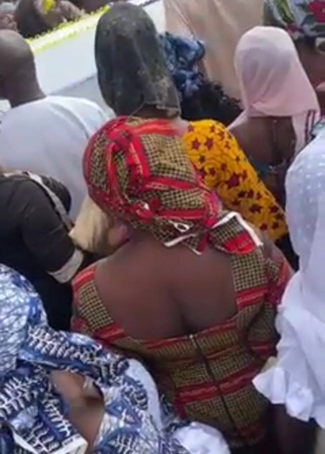 A crowd of people, mostly women, have gathered outside, surrounding a white coffin. The women are dressed in colorful traditional African clothing. Some of them wear headscarves or veils. The coffin is the central object of attention, and people are standing closely around it. The surroundings include buildings and trees, suggesting a residential or community setting. The video appears to capture a solemn event, possibly a funeral or memorial service.