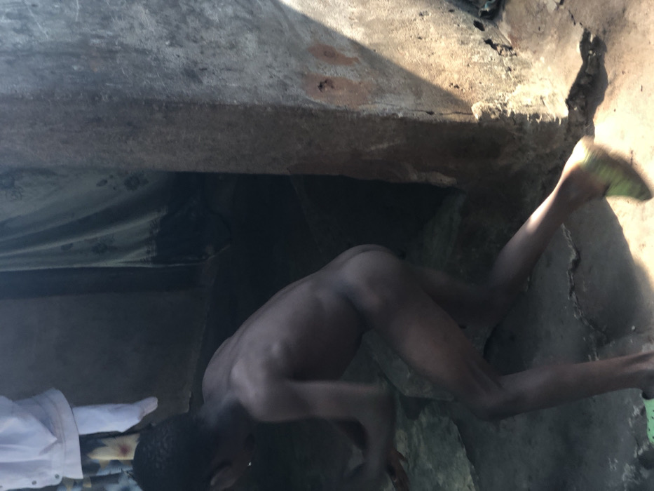 The image depicts a young, dark-skinned male standing nude, save for a light-colored slipper on the right foot, in a bent-over or crouching posture. The individual is oriented with his back partially to the camera, facing towards the left side of the frame. The setting is a semi-enclosed or sheltered outdoor area within the city of Orifite, Nigeria. The environment includes rough, textured walls, possibly constructed from concrete or mud, showing signs of wear and discoloration. In the background, two pieces of clothing hang: one white garment on the left and a dark green/blue patterned fabric on the right. A prominent concrete pillar or wall section occupies the right foreground, exhibiting cracks and reddish-brown marks. The ground is uneven and appears to be made of concrete or packed earth. Natural light illuminates the scene primarily from the right, creating shadows that darken the background elements. The individual's posture suggests movement or an ongoing action. No other people or specific interactions are visible.