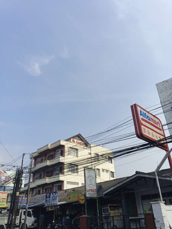 This image captures a daytime street scene under a clear blue sky with faint wisps of clouds. A dense array of black electrical and communication wires traverses the upper and mid-portions of the frame. On the right, a prominent vertical Alfamart sign, red with white and blue lettering, is visible, affixed to a red support pole. In the background, a multi-story building, light in color with reddish-brown accents on its balconies, displays a red "AMEN" sign on its peaked roof. Below this building, at street level, multiple ground-floor businesses are present, indicated by various signs, including "WARUNG PECEL LEL" and "SATRIA 1". Several individuals are discernible at street level near these establishments, and multiple motorcycles are parked. A white pickup truck is partially visible on the far left. The setting depicts an active commercial area. The location is in the city of Unknown, Cambodia.