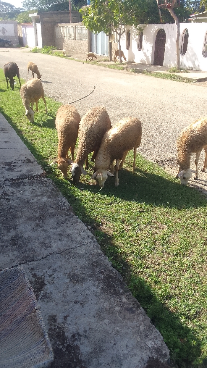A flock of sheep graze on grass lining a road. A black sheep is visible to the left, with other sheep in varying shades of brown and tan scattered throughout the scene. One sheep has a white face. In the background is a residential neighborhood featuring houses with white walls and various architectural details. The pavement and sidewalk are visible on the left, with a corner of a woven mat.