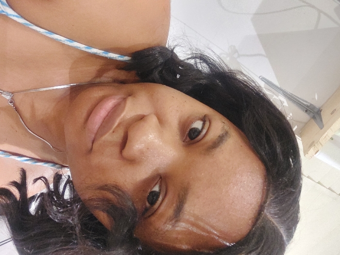 A close-up shot of a woman with dark hair and brown skin. She wears a silver necklace and a top with blue and white straps. Her face is slightly angled, showing her nose, lips, and eyes clearly. The background is a plain white wall, with some fixtures visible in the upper right corner.