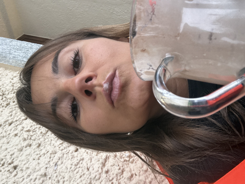 An adult female is depicted in a close-up, low-angle image captured in Limone Piemonte, Italy. Her head and upper torso are prominent, with medium-long brown hair and bangs framing her face. She has brown eyes, and visible mascara on her eyelashes. Her lips are pursed, with a distinct white, frothy residue present on her upper lip. A silver-colored hoop earring is visible on her right earlobe. She is wearing a black garment and an orange garment is partially visible on her left side. A clear glass mug, containing remnants of a light brown, possibly frothy, beverage, is partially visible in the bottom right quadrant of the frame, with its handle prominently featured. The background consists of a textured, light beige wall on the left, and a metallic, possibly corrugated, surface with a dark vertical structure on the upper right.