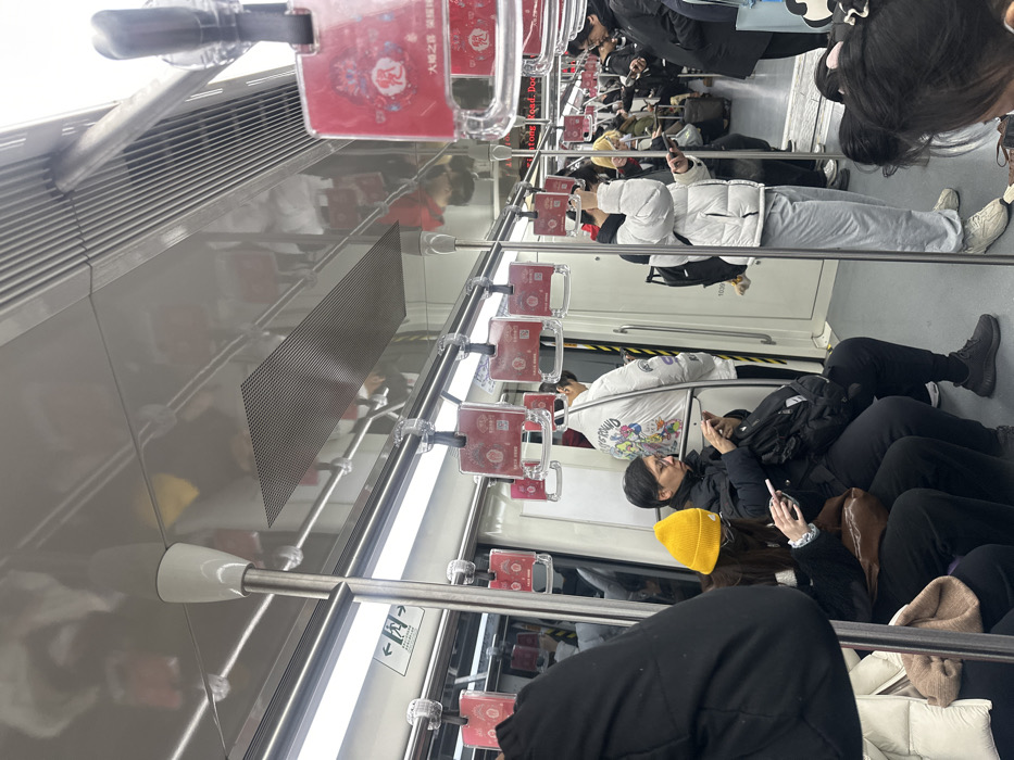Inside a subway car, passengers are seen seated and standing. Several are using their mobile phones. Red advertisements are affixed to the handrails. The interior has a gray and white color scheme. Overhead lighting and a perforated ventilation panel are visible. The photo is taken at an angle, making the scene appear slanted.