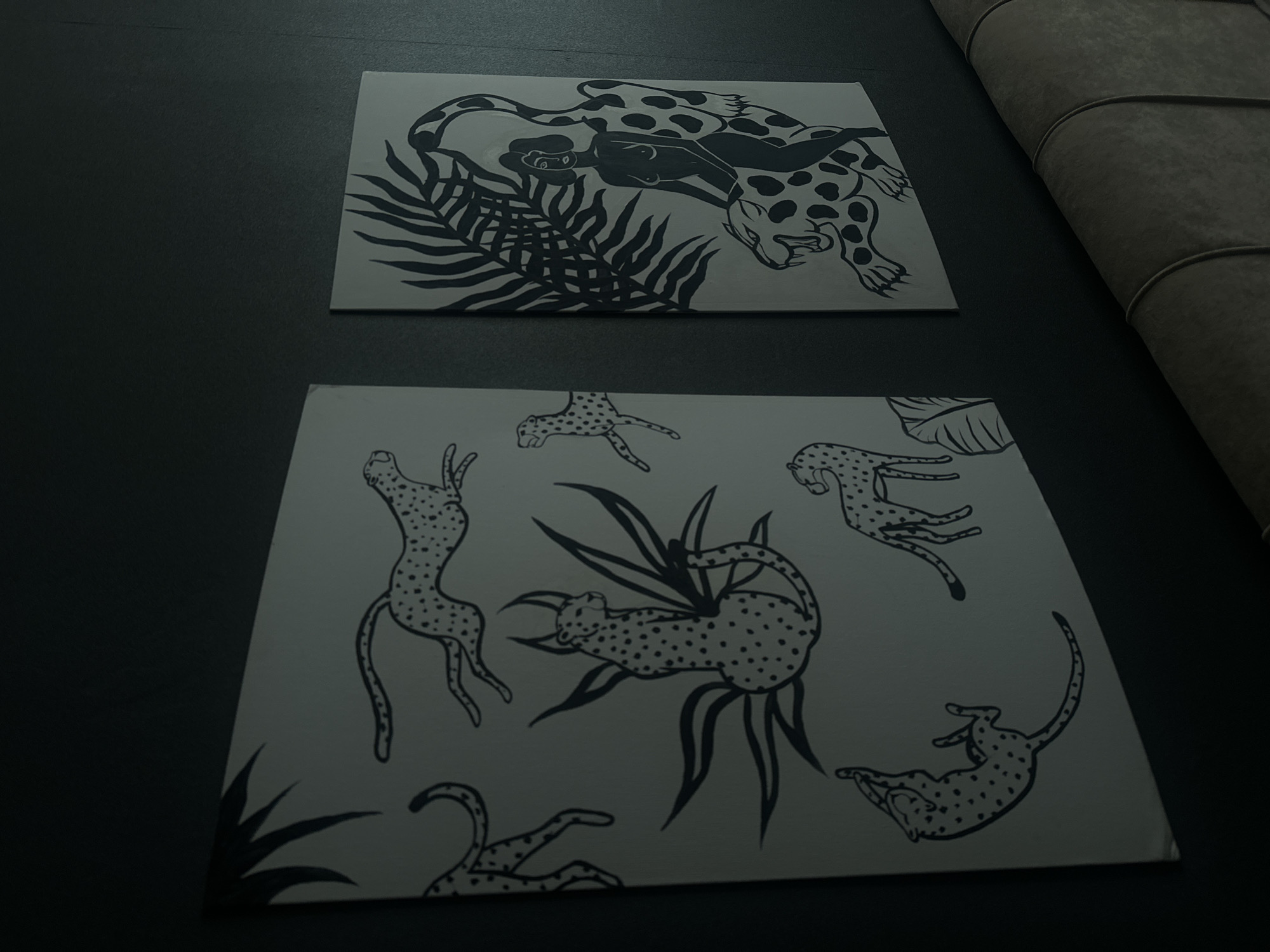 The image displays an interior room featuring dark-colored walls, likely dark grey or dark green, under dim ambient lighting. Two framed or mounted artworks with stylized black-and-white illustrations are visible on the wall above a dark, upholstered headboard with vertical tufting, suggesting a bedroom setting. The larger artwork, positioned on the left, is a horizontal rectangular piece. It features multiple illustrations of cheetahs or leopards. These include a cheetah in a running posture at the top right, a horned cheetah seated centrally amidst stylized plant fronds, and another cheetah lying on its back, appearing playful, in the lower left. Additional partial figures of cheetahs are also present. The smaller artwork, positioned to the right, is a vertical rectangular piece. It depicts a nude female figure, rendered in solid black silhouette, sitting astride a large, roaring cheetah or leopard with visible fangs and extended claws. A prominent, dark, stylized palm frond or tropical leaf motif is depicted behind the figures. No specific location within the city of Saint Petersburg, Russia, can be determined from the visual information provided in the image.