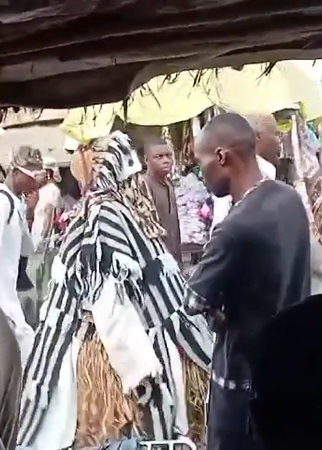 A crowded market scene unfolds beneath a makeshift shelter of corrugated metal and fabric. People mill about, some wearing traditional white clothing, others in more modern attire. One person balances a large metal bowl on their head, weaving through the crowd. The overall impression is one of activity and commerce in a bustling outdoor setting.