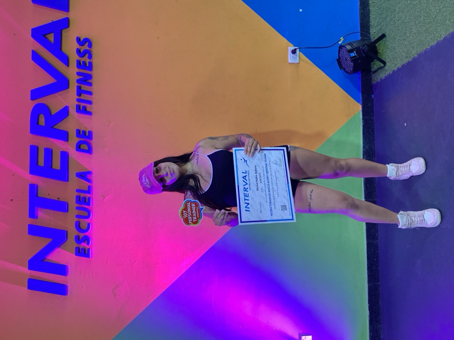 A female subject stands centrally in an indoor setting, identified as Interval Escuela de Fitness in Quilmes, Buenos Aires, Argentina