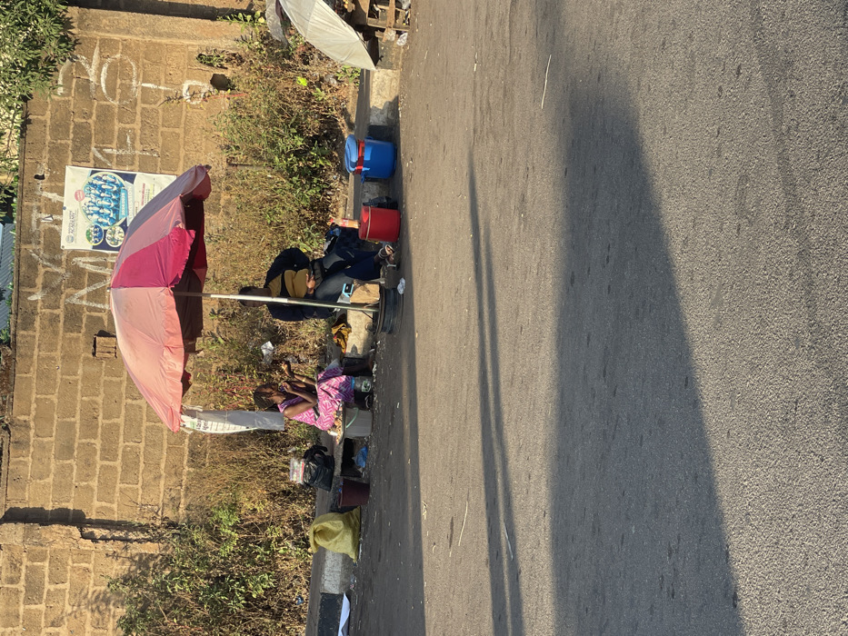 The image depicts an outdoor street scene in Barakin Lerawi, Nigeria, featuring two individuals seated under a large, open, two-toned red and pink parasol