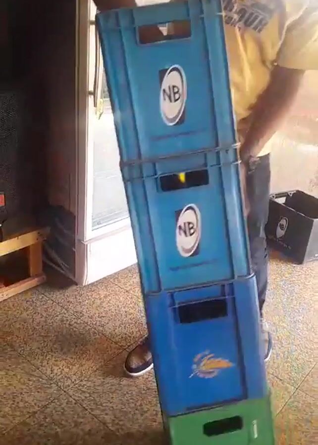 A person in a yellow shirt is seen struggling to hold a stack of beer crates