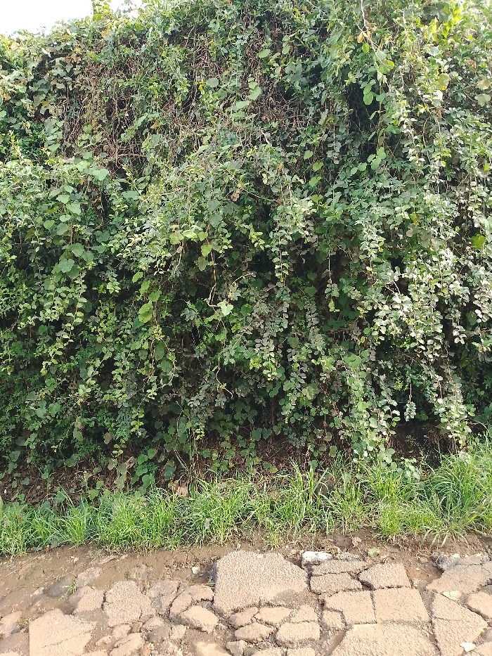 The image captures an outdoor scene in Olkeri ward, Kenya, dominated by a dense wall of verdant vegetation fronting a severely deteriorated paved surface. The upper two-thirds of the frame displays a thick, overgrown mass of green foliage, composed of numerous intertwined vines, shrubs, and plants exhibiting varying shades of green, from light to dark, with some desiccated brown stems and leaves visible amidst the living growth. Directly below the dense vegetation, a strip of unmaintained green grass, approximately 10-15 centimeters tall, runs horizontally across the image. The lower third of the scene features a heavily fragmented and cracked paved surface, likely asphalt, broken into numerous irregular pieces that expose underlying dark soil and debris. Small areas of exposed dirt and mud are visible within the gaps of the broken pavement. No individuals, animals, or active subjects are present.