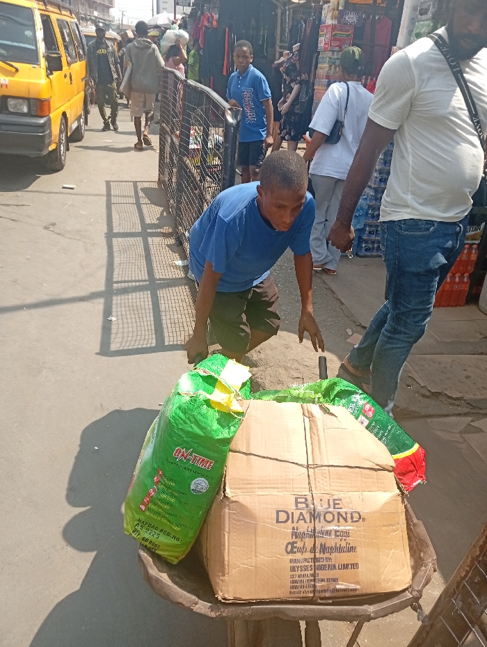A young man in a blue t-shirt is crouched over a wheelbarrow loaded with goods on a busy street. In the wheelbarrow, there's a green bag labeled "ON-TIME" and a cardboard box branded with "BLUE DIAMOND," which indicates naphthalene balls manufactured by Ulysses Nigeria Limited. People and a yellow van pass by in the background, suggesting a bustling market or commercial area. The image captures the effort and activity typical of such a setting.