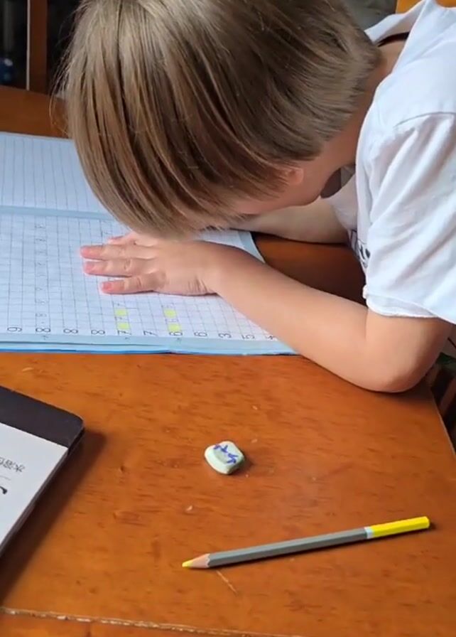 A young blond-haired boy in a white shirt sits at a wooden table, doing his homework. He leans his head on his hand and looks at a page filled with numbers and boxes. He picks up his pencil and writes something on the page. There's a black notebook to his left, an eraser, and a yellow and gray pencil on the table. The room is bright and appears to be a dining or study area.