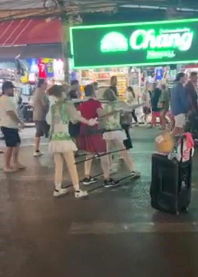 four people standing on a three-rung ladder in the middle of a crowded street in front of a Chang beer sign. They are all wearing short dresses. Three of them are wearing white sneakers and one is wearing black sneakers. They are all holding each other's hands and attempting to walk or move together. There are people walking around them. There is a black speaker and a suitcase to the right of the ladder. The street looks wet.