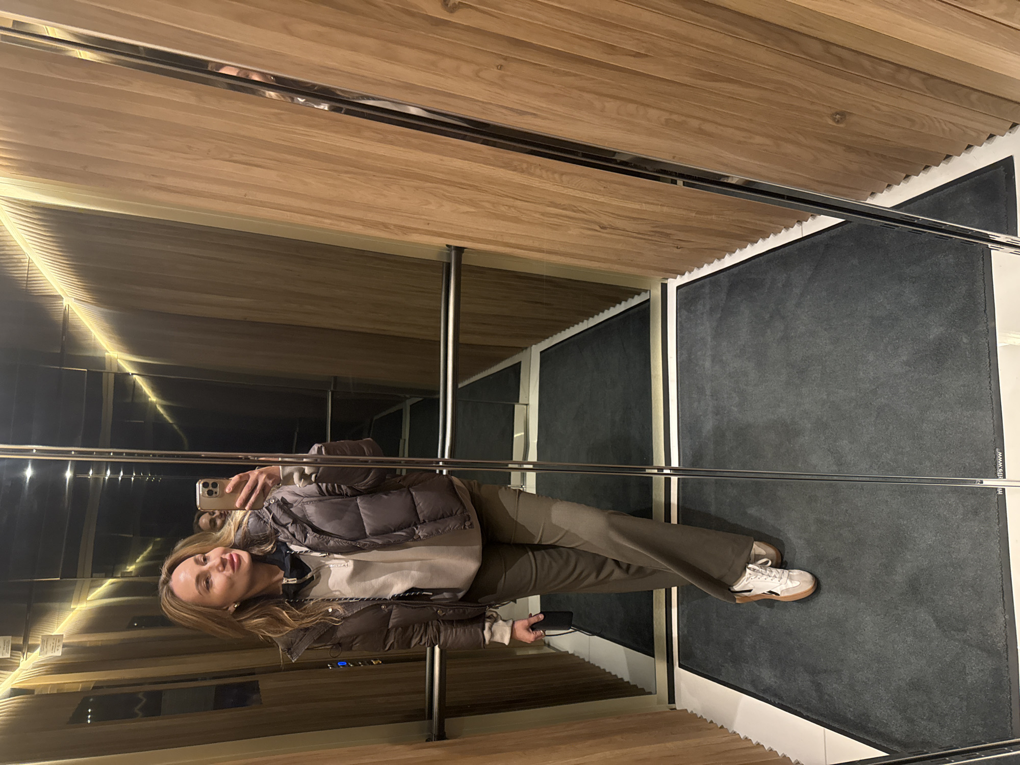 An adult female is depicted standing within a mirrored elevator, actively engaged in taking a selfie. She holds a gold-colored smartphone in her right hand, angled towards her reflection. Her left hand holds a separate black object, possibly another phone or a small device. The subject has long, light brown hair. She is dressed in a dark brown puffer jacket worn over a light beige quarter-zip sweatshirt, paired with olive green wide-leg trousers and white and beige athletic shoes. A thin-strapped black bag is slung across her body. Her expression is a subtle smile. The elevator interior features walls composed of vertical, light-toned wooden panels, possibly oak, with a subtle textured or fluted design. Warm, indirect lighting illuminates the space from the top edges of these panels. The floor is predominantly covered by a dark grey rectangular mat with a black border, resting on a white tiled surface. Multiple large mirror panels form the elevator walls, creating reflections of the subject and the interior architecture. A horizontal metallic handrail is present on the left side of the elevator compartment. The scene is located within an elevator in the city of Riga, Latvia. The specific building or precise location within Riga cannot be identified from the visual data.