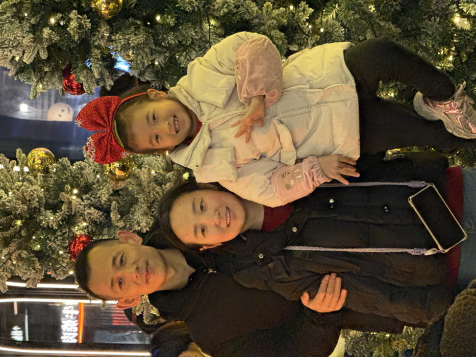 A photograph captures three individuals, two adults and one child, posing outdoors at what appears to be a commercial or public area in Liangjiang, China