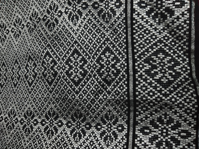 The image displays a close-up view of a woven textile, characterized by a high-contrast black and white (or very dark and light) geometric pattern