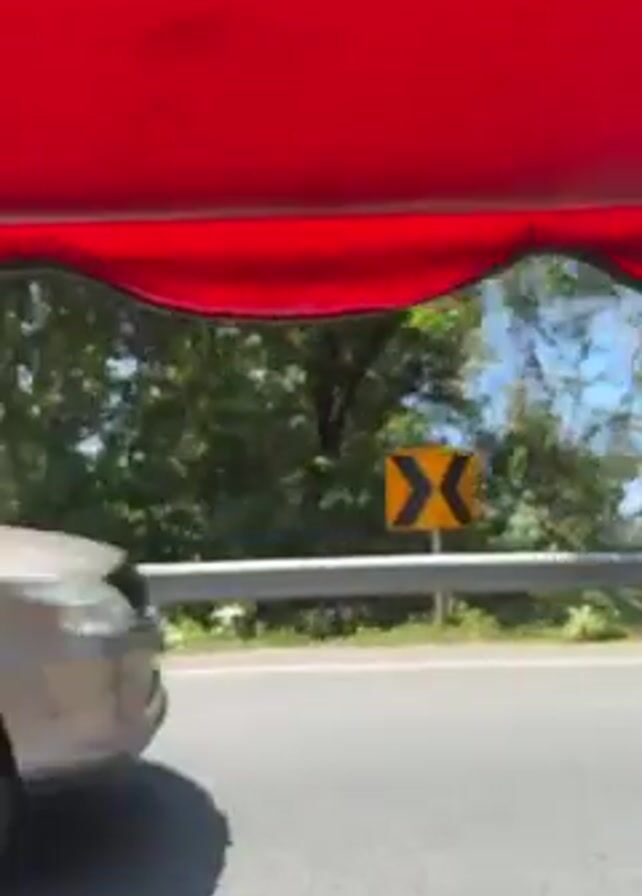The view from inside a moving vehicle with a red canopy shows a gray asphalt road with a silver guardrail. Green trees and vegetation are visible on the side of the road. A black scooter with three riders wearing helmets passes on the road.