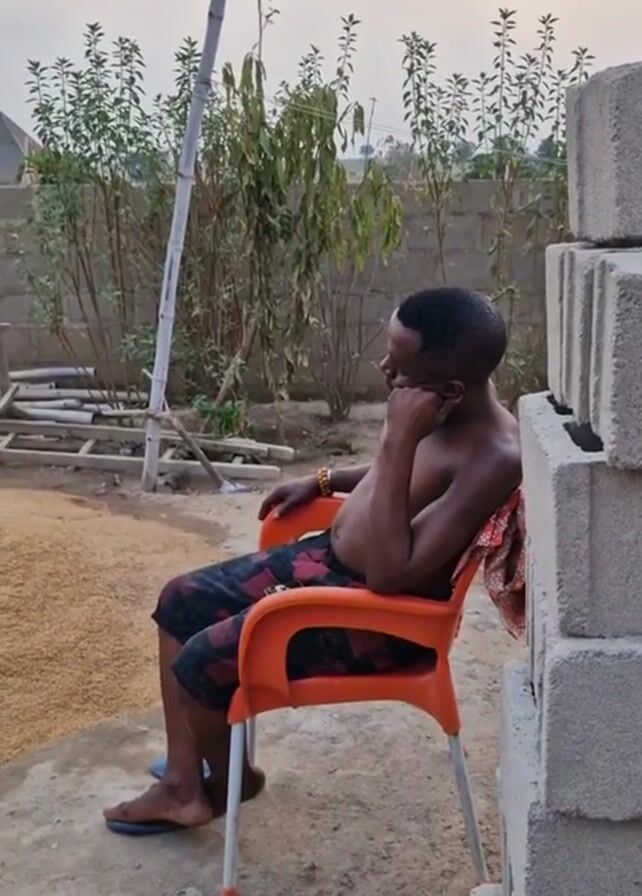 n outdoor construction site, with three men. One man is sitting on a bright orange chair, wearing patterned shorts and sandals, with his shirt off. He rests his head on his hand, appearing pensive. There are stacks of grey bricks beside him, and a mound of sand or gravel in the background. Two other men are seated on a low brick structure. One wears a light brown shirt and dark pants, and seems to be eating. The other man is shirtless, with a light blue shirt draped over his shoulders. Both men are wearing dark pants and sandals. The construction site includes cinder blocks, wooden planks, a blue and yellow portable toilet, and various building materials scattered around. A low cinder block wall surrounds the site, and sparse trees and plants border the yard. The sky is overcast.