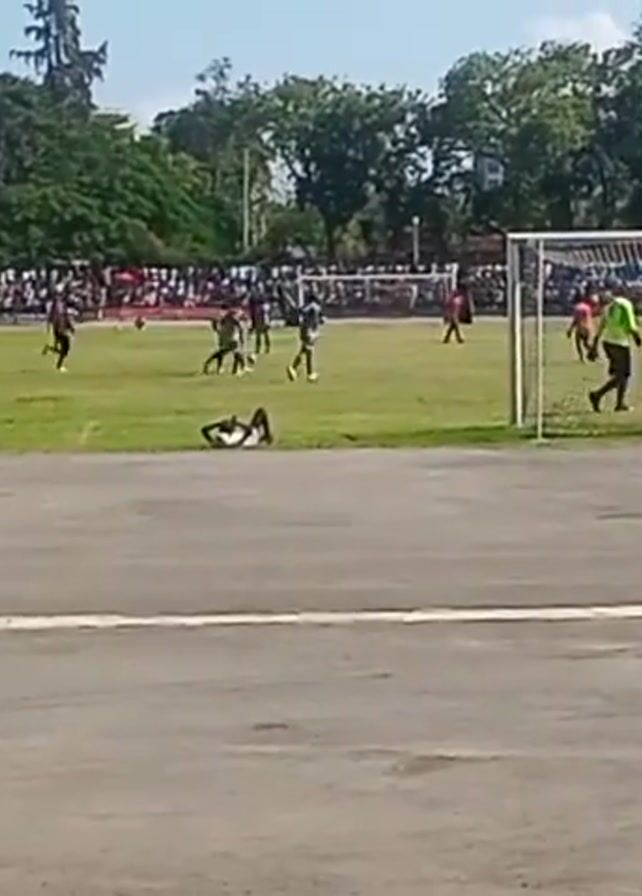 soccer game in progress at a stadium. The players are wearing dark-colored and red-colored jerseys. The goalie is in a bright yellow jersey. There is a player lying on the ground. The stadium is packed with spectators. There are trees in the background.