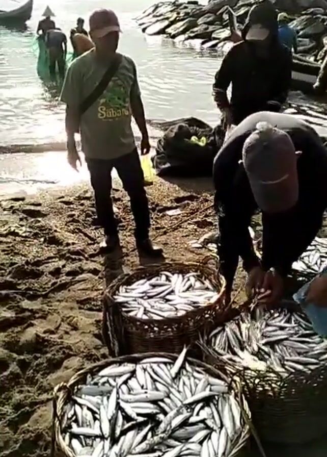 group of fishermen on a beach with several baskets filled with small, silver fish