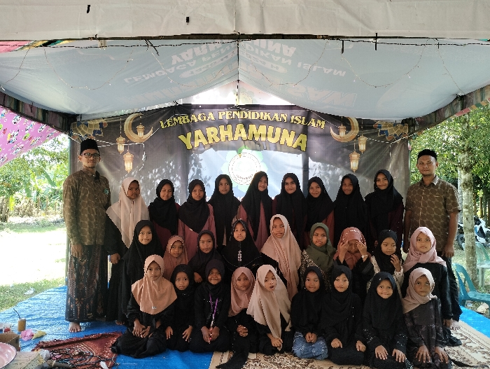 An outdoor group portrait in Jambo Dalam, Indonesia, features 29 individuals positioned under a white canopy tent. Two adult males stand on either side of the group. The male on the left wears a patterned shirt, a sarong, and a peci, while the male on the right wears a patterned shirt and a peci. The remaining 27 individuals are females, ranging from young children to young adults, all wearing hijabs and modest clothing, predominantly dark colors. They are arranged in three rows: two standing rows in the back and a seated row of younger girls in the front, all facing the camera. One girl in the seated row is partially covering her face with her hands. Behind the group is a dark banner displaying "LEMBAGA PENDIDIKAN ISLAM YARHAMUNA" in yellow and white text, accompanied by crescent moon and lantern motifs. The ground beneath the tent is covered with a blue tarpaulin, upon which two patterned prayer rugs and miscellaneous items, including a pink bowl and cups, are visible in the left foreground. Beyond the tent, green foliage, trees, and natural ground are visible under bright daylight.