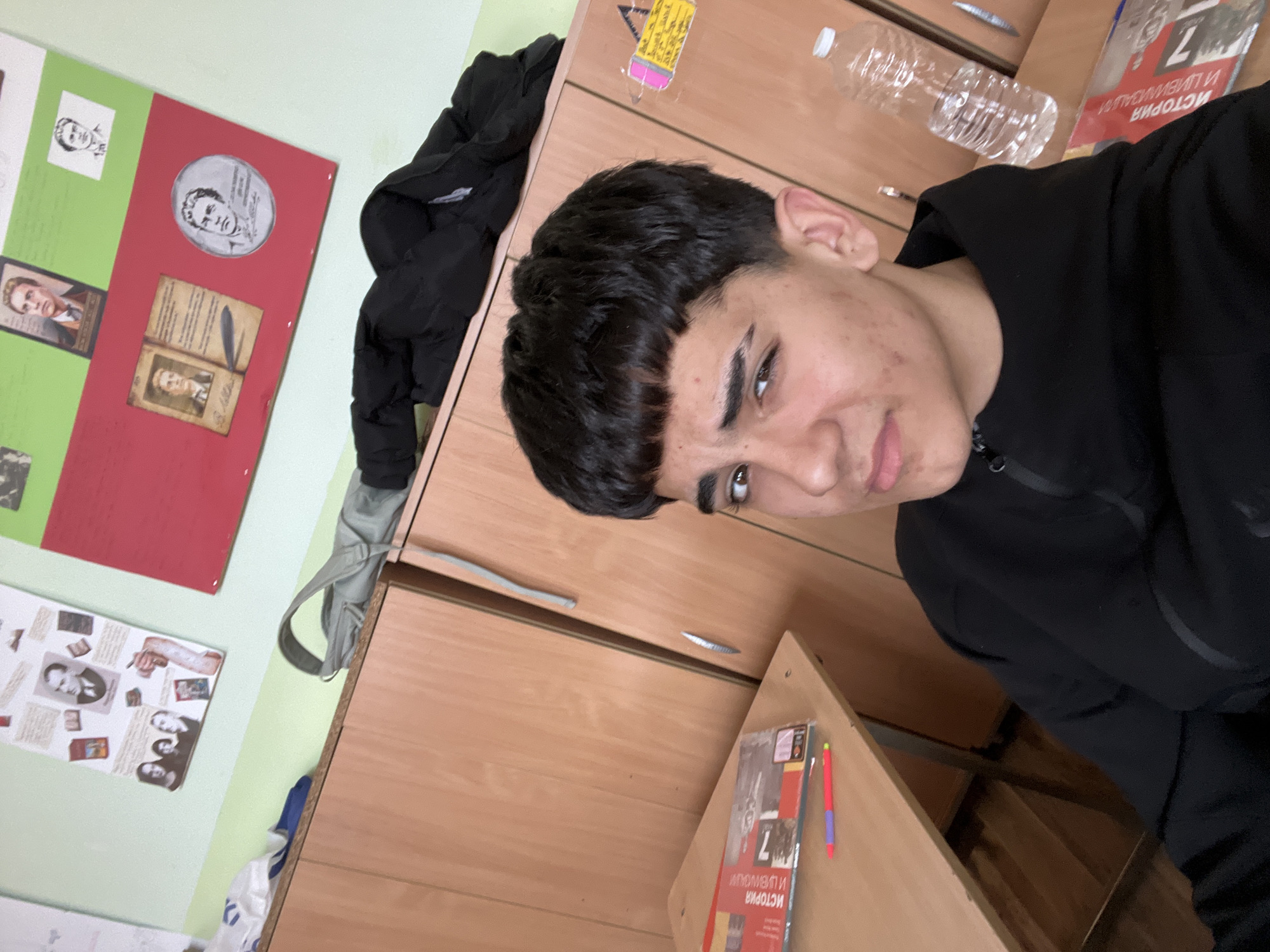 A young male, approximately a teenager, with dark hair, prominent eyebrows, and facial blemishes, is depicted from the chest up, looking directly at the camera with a slightly questioning expression. He wears a black zippered hooded sweatshirt. The scene is a school classroom in Tervel, Bulgaria. This identification is based on the visible Bulgarian language textbooks titled "ИСТОРИЯ И ЦИВИЛИЗАЦИИ 7" (History and Civilizations 7) and educational posters on the wall featuring Bulgarian historical figures, notably a circular medallion image of Hristo Botev. The male is seated at a light-colored wooden desk, where the aforementioned textbook and a pink and purple pen are present. To the right, on an adjacent desk surface, a clear plastic water bottle, partially filled, is visible. The background consists of light green walls adorned with multiple informational posters and light-colored wooden storage cabinets. On top of the cabinets, a grey backpack and a folded black puffer jacket are observed.