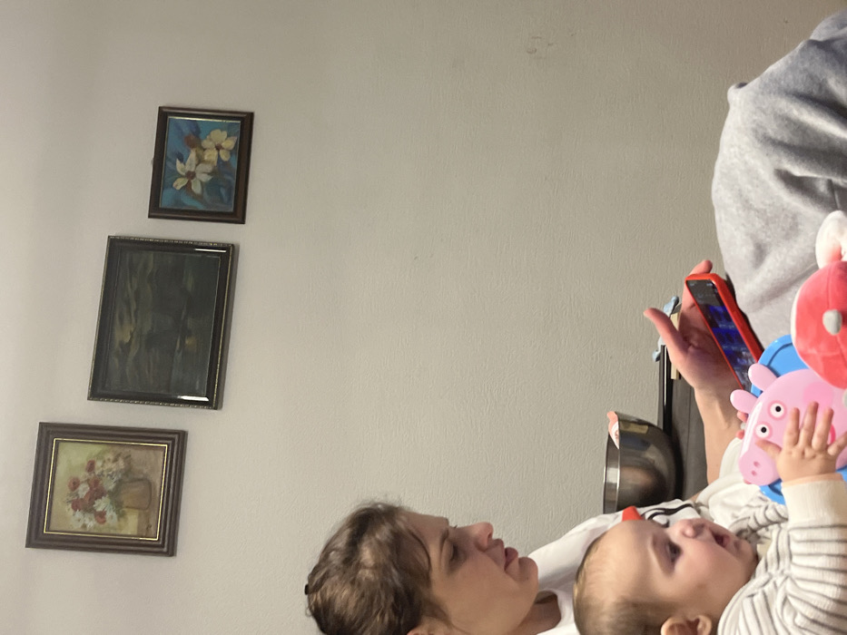 A baby lies in bed with a woman, presumably his mother. The baby wears a striped outfit and reaches for a Peppa Pig toy. The woman looks toward the baby. An adult, wearing a gray hoodie, holds a red phone near the baby. On the wall are three framed pictures. One features white flowers, another is a dark, reflective piece, and the last shows a bouquet of flowers in a vase.