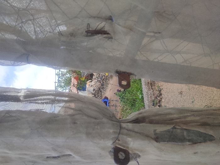 The image depicts a view through two parted, torn, and light-colored fabric or netting panels, revealing an outdoor scene in Khan Yunis, Palestinian Territory. The panels, possibly serving as a makeshift curtain or screen, feature rusted metal eyelets or hooks secured with wire. Through the central vertical opening, a dirt or gravel path is visible at ground level, flanked by green vegetation on the left. Beyond the path, scattered debris or rubble is piled. In the mid-ground, a blue plastic chair is partially discernible amidst the debris, with a structure featuring a red roof and green trees in the background. The sky above is partly cloudy. No people are visible.