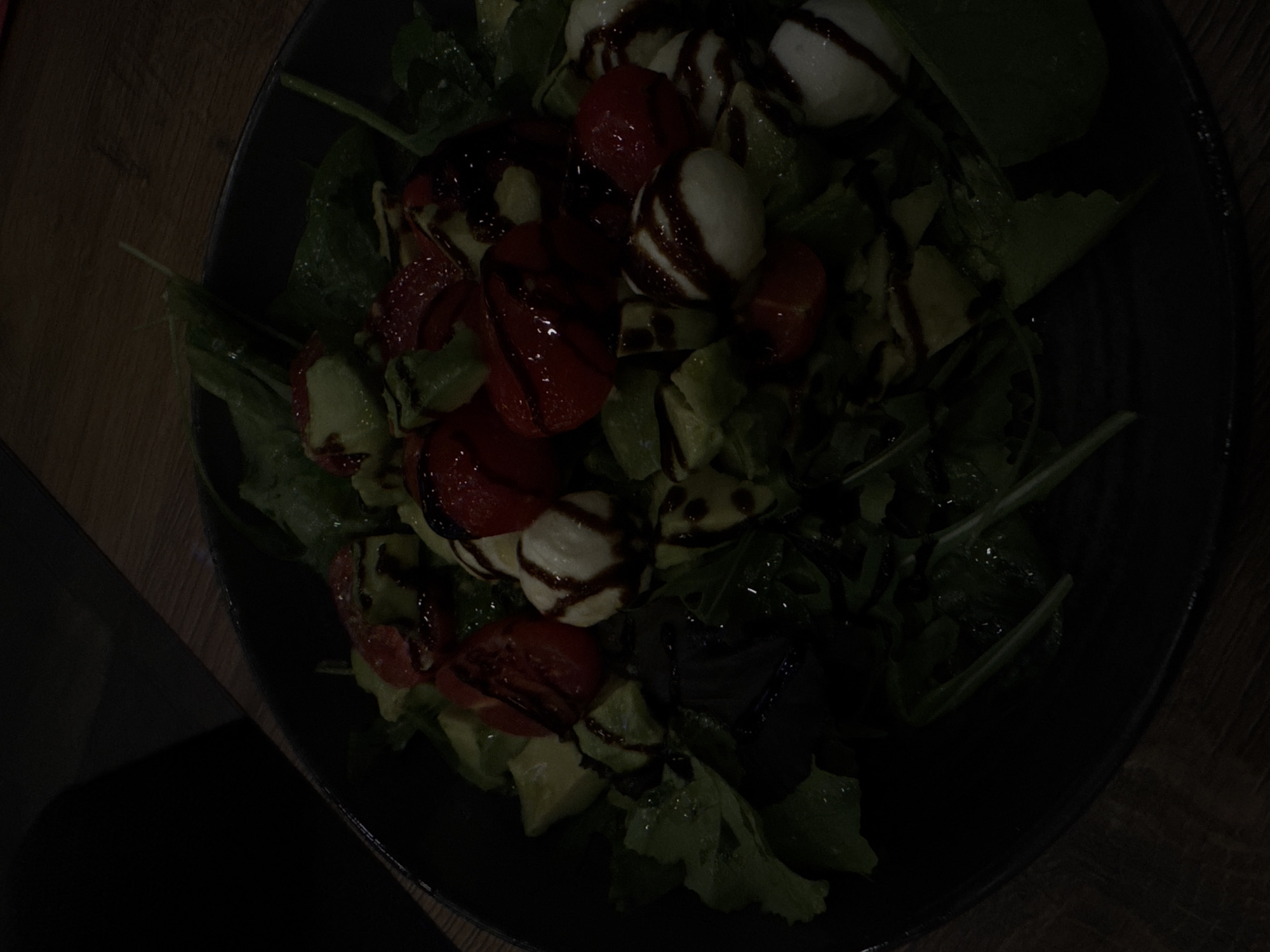 The image depicts a salad in a black bowl. The salad consists of mixed greens, halved cherry tomatoes, small balls of mozzarella cheese, and slices of avocado. A dark drizzle of balsamic glaze or reduction covers the components. The bowl rests on a dark surface, potentially a table. The location is not discernible, and there is no indication of a city or country in the image. No people, actions, or interactions are visible.