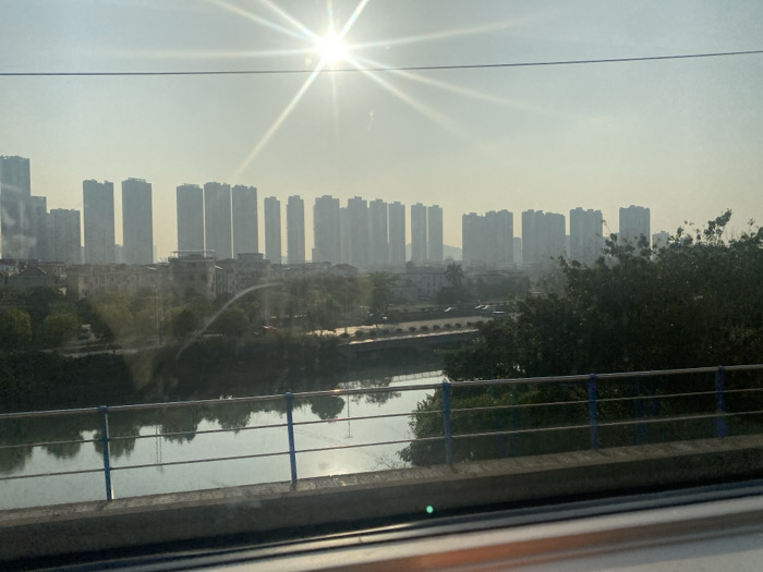 The image depicts a panoramic urban landscape in Shunde District, China, viewed from an elevated vantage point. In the foreground, a concrete bridge railing with blue vertical posts and horizontal metallic bars is visible, spanning the bottom portion of the frame. Immediately beyond the railing, a calm body of water, likely a river or canal, reflects the sky and distant foliage. The midground features a line of dark green trees and shrubs on the far bank, with a visible paved area or road running parallel to the waterway. The background is dominated by a dense arrangement of numerous tall, rectangular high-rise buildings, likely residential, silhouetted against a hazy sky. A bright, multi-rayed sun is prominently positioned in the upper left quadrant of the sky, creating a strong lens flare. The overall atmosphere is bright with significant atmospheric haze. No individuals or specific activities are discernible within the scene.