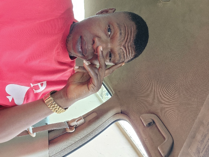 A man in a red shirt with a white spade design is inside a car. He's wearing a gold watch on his left wrist and has his fingers near his face, seemingly in thought. The interior of the car is beige, visible on the ceiling and safety belt. The man's gaze is directed towards the camera.