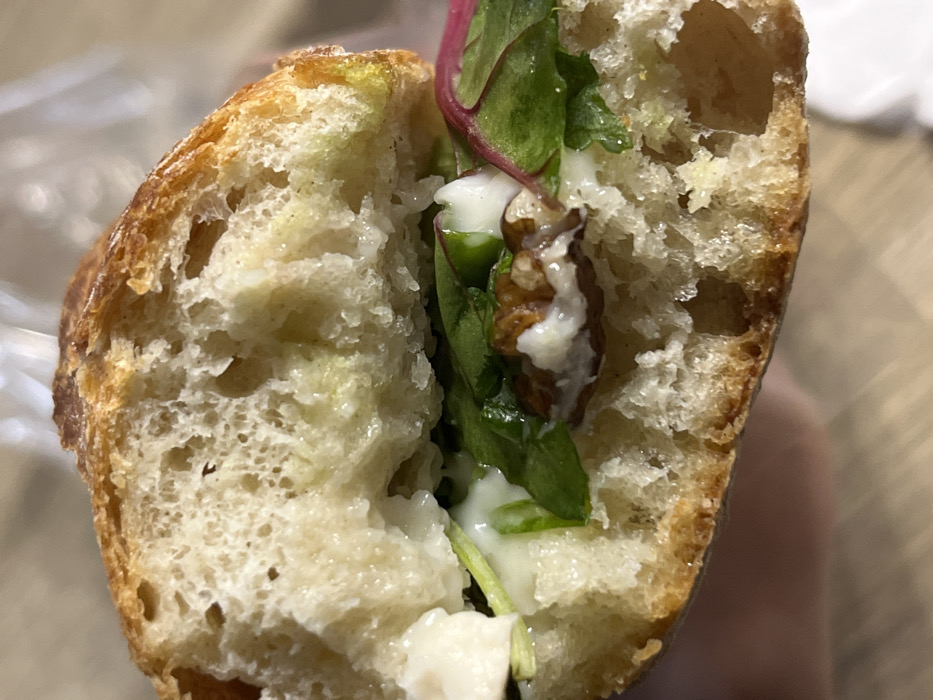 The image displays a close-up, cross-sectional view of a sandwich segment, presumably a baguette or rustic bread roll, cut open horizontally to reveal its internal composition. The bread features a golden-brown, textured crust and a porous, off-white crumb. The fillings consist of a layer of diverse green leafy vegetables, some exhibiting reddish-purple tints, interspersed with a thick, opaque white creamy substance (consistent with a soft cheese or sauce). Several distinct pieces of shelled walnuts are visible among the other ingredients. The background is out of focus, indicating an indoor environment with indistinct light and shadow patterns. No individuals, actions, or interactions are depicted. The scene is located in Bagnolet, France.