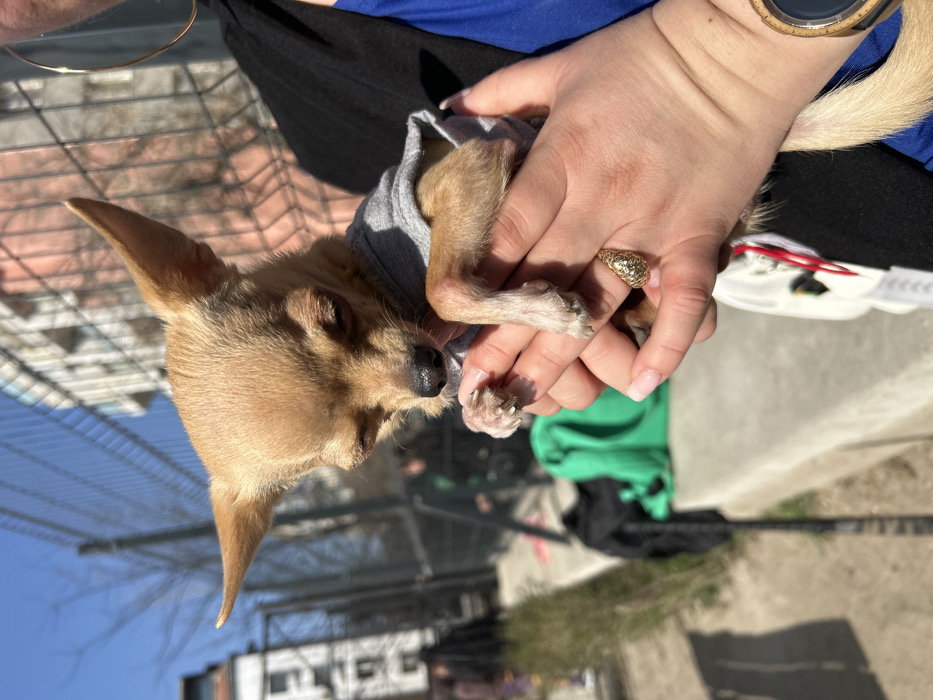 A small, tan-colored Chihuahua dog wearing a grey top is held by a person in an outdoor, brightly lit urban environment in the city of Plovdiv, Bulgaria