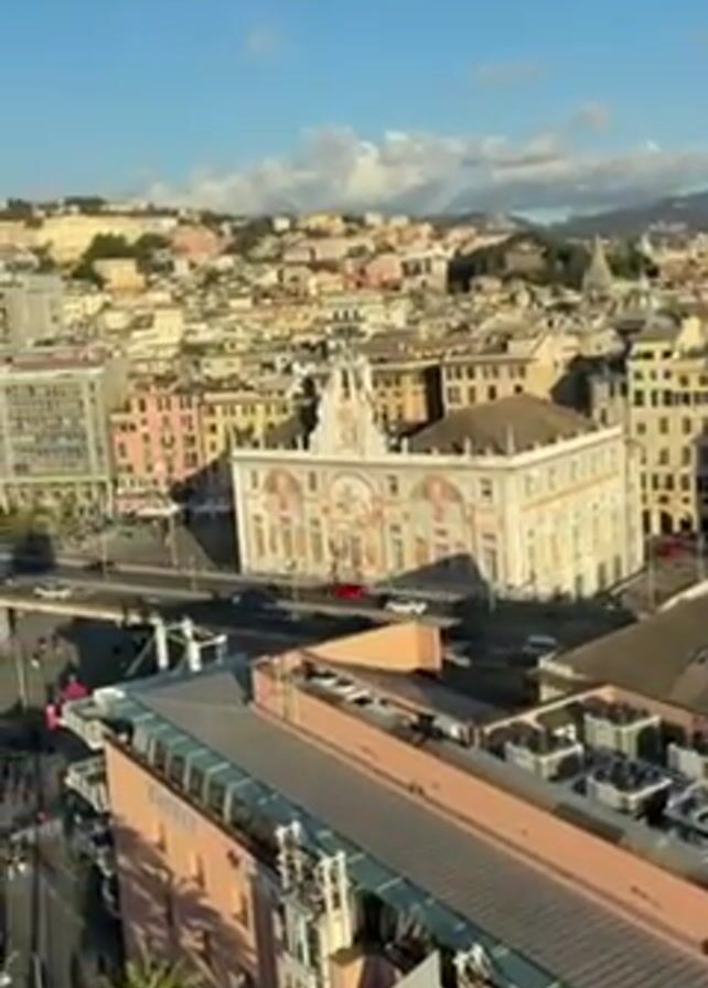 panoramic view of a city with various buildings and a clear blue sky with some clouds. The city has a mix of old and modern architecture with buildings of different colors. There are palm trees lining a waterfront area and a road with cars moving along it. A building with the word "EATALY" is visible in the foreground. The video pans to reveal more of the city skyline and the surrounding hills.