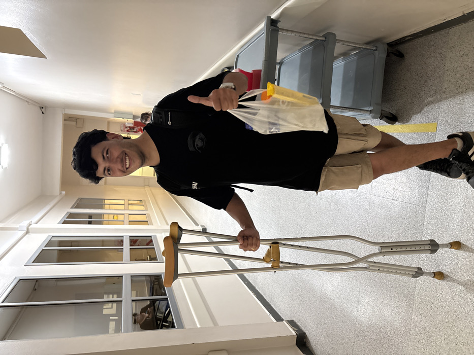 A smiling man in a black t-shirt and beige shorts stands in a hospital hallway, holding crutches and a plastic bag