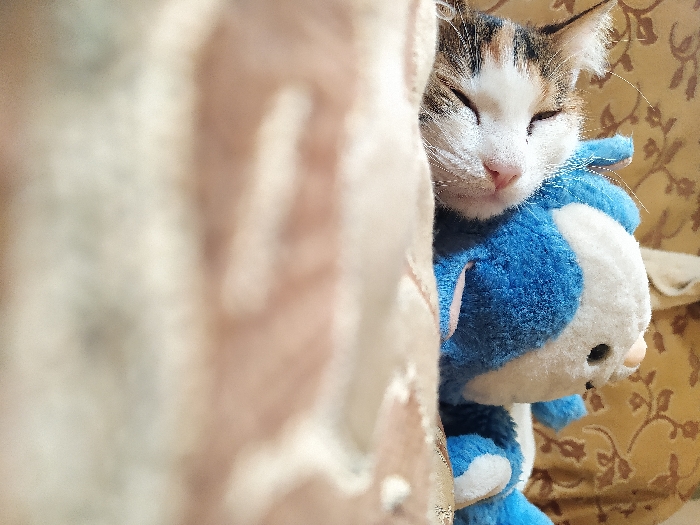 An indoor scene in Harasta, Syria, depicts a domestic cat sleeping on a light-colored, soft surface, likely a bed or couch. The cat, exhibiting white, brown, and dark brown fur patterns on its face and ears, has its eyes closed. It is positioned on its side, cuddling a blue and white plush toy, which features a rounded body and white underside. The toy is held close to the cat's head. The immediate foreground is a blurred, light beige fabric. The background consists of a blurred, patterned fabric, possibly upholstery, with gold-brown tones and darker, swirling motifs. No other individuals or objects are clearly discernible.