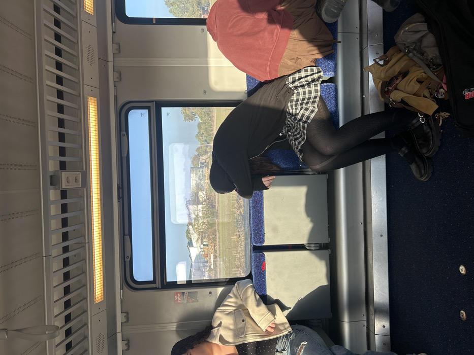 - "Inside a train car, a young person in a black hoodie and plaid skirt sleeps, head on the seat back" by FM-sApNa2, licensed under CC BY 4.0
