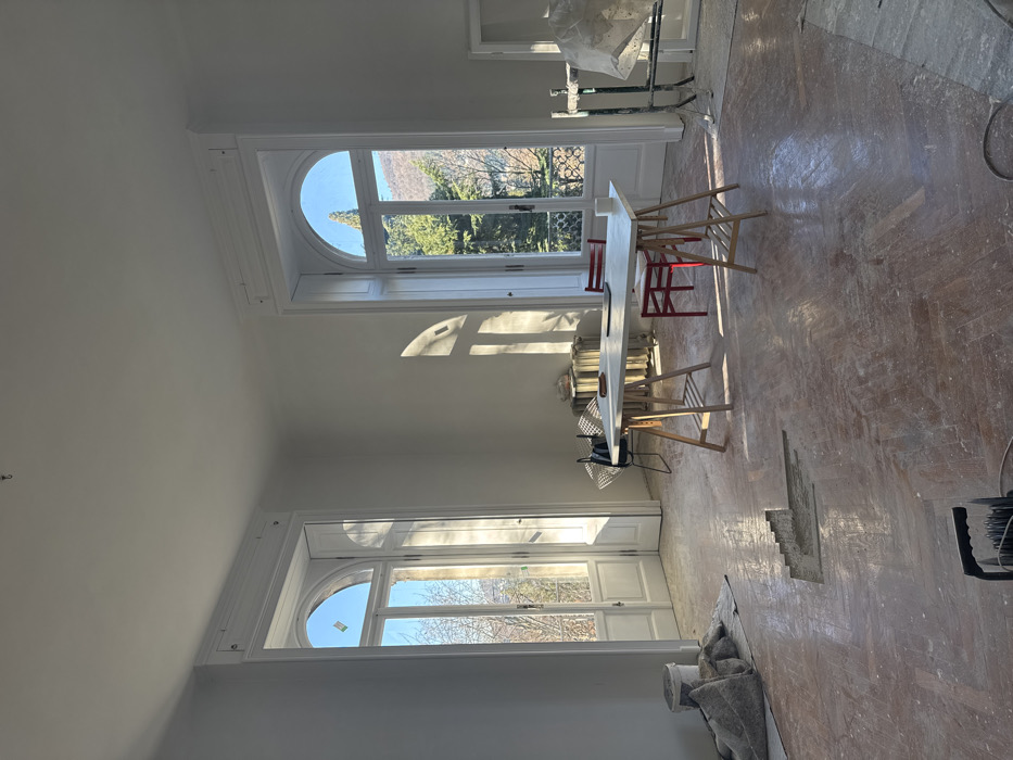This image captures an unfurnished room in Erba, Italy, appearing to be in a state of renovation or post-renovation. The room features white painted walls and a partially exposed herringbone parquet floor covered in dust and debris. A rectangular section of the flooring in the central-left foreground has been removed, revealing a stepped concrete subfloor. Two large, white-framed French windows with arched transoms are present on the left and right walls, admitting significant natural sunlight that casts distinct shadows across the floor and walls. The left window has a small green sticker affixed to its upper pane and provides a view of distant bare trees. The right window offers a clear view of dense green trees, a distant hill, and a wrought-iron balcony railing. In the center of the room, a white tabletop rests on two wooden sawhorse trestles, serving as a temporary work surface. On this table are a dark rectangular device, a smaller dark object, and a white mug. A single red-framed chair with a white woven seat is positioned beneath the table. To the left of the table, a dark-framed chair with a white woven seat is visible near a grey wall-mounted radiator. Near the left window, a white bucket and a rolled-up grey textile are on the floor. To the far right, a scaffold-like structure is partially covered with white material, and a white door frame is visible. No individuals are present in the scene.