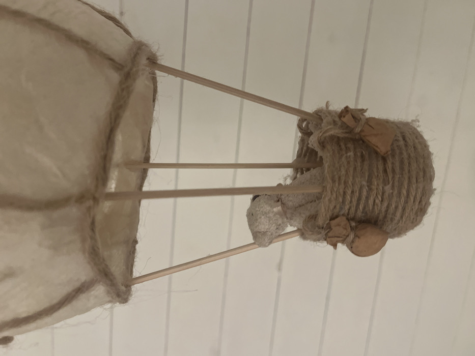 The image depicts a miniature decorative hot air balloon model, suspended against a light-colored, horizontally paneled background, indicative of an interior wall. The balloon's envelope is crafted from a translucent, off-white fabric, possibly paper or thin cloth, stretched over an internal frame and secured with beige twine detailing around its circumference. Slender wooden dowels extend downwards from the balloon, forming the structural support for the gondola. The gondola is a cylindrical basket, constructed from coiled natural fiber twine, with several small, brown, sack-like objects, resembling ballast bags, tied to its exterior. Inside the basket, a small, light-colored, textured teddy bear is seated, facing away from the viewer towards the left. The background features distinct horizontal lines, suggesting shiplap or beadboard paneling. The lighting is soft and ambient. The image provides no discernible information regarding its location within Stockholm, Sweden, or any other specific geographic area.