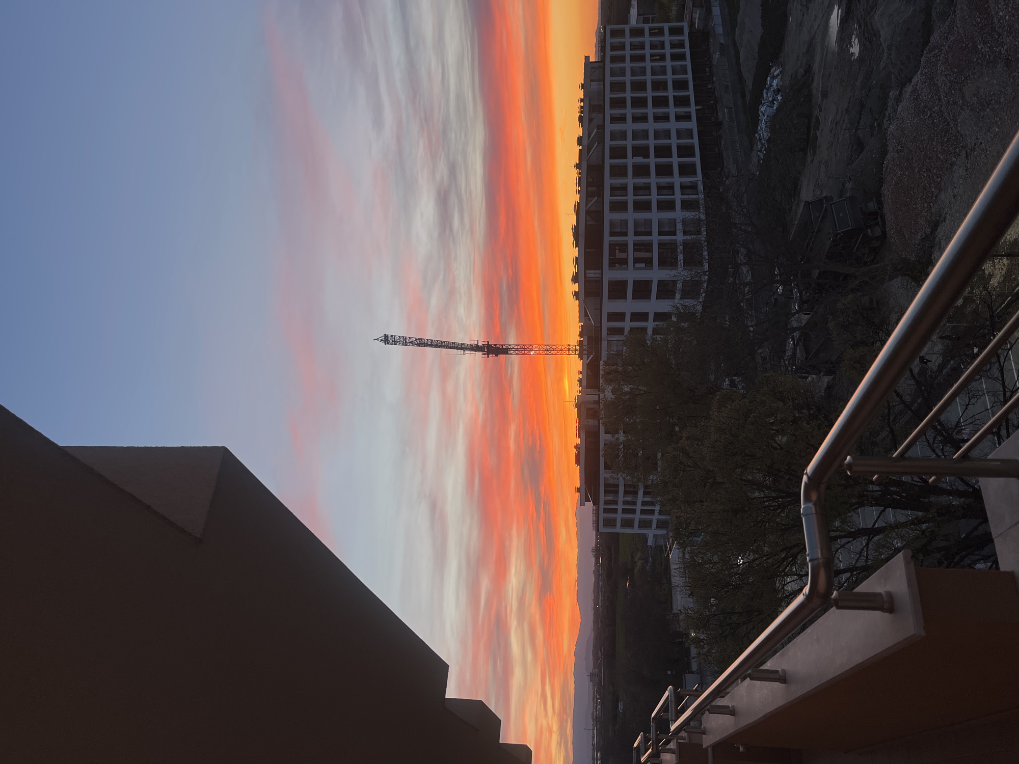 The image captures a colorful sunset sky above Plovdiv, Bulgaria. A construction crane stands silhouetted against the orange and white sky. A tall, modern building with a grid-like facade is situated to the right of the crane. A construction site with piles of materials is visible next to the building. A metal railing is in the foreground. In the background, a mountain range can be seen. The image seems to be taken from a high vantage point, such as a balcony or rooftop.